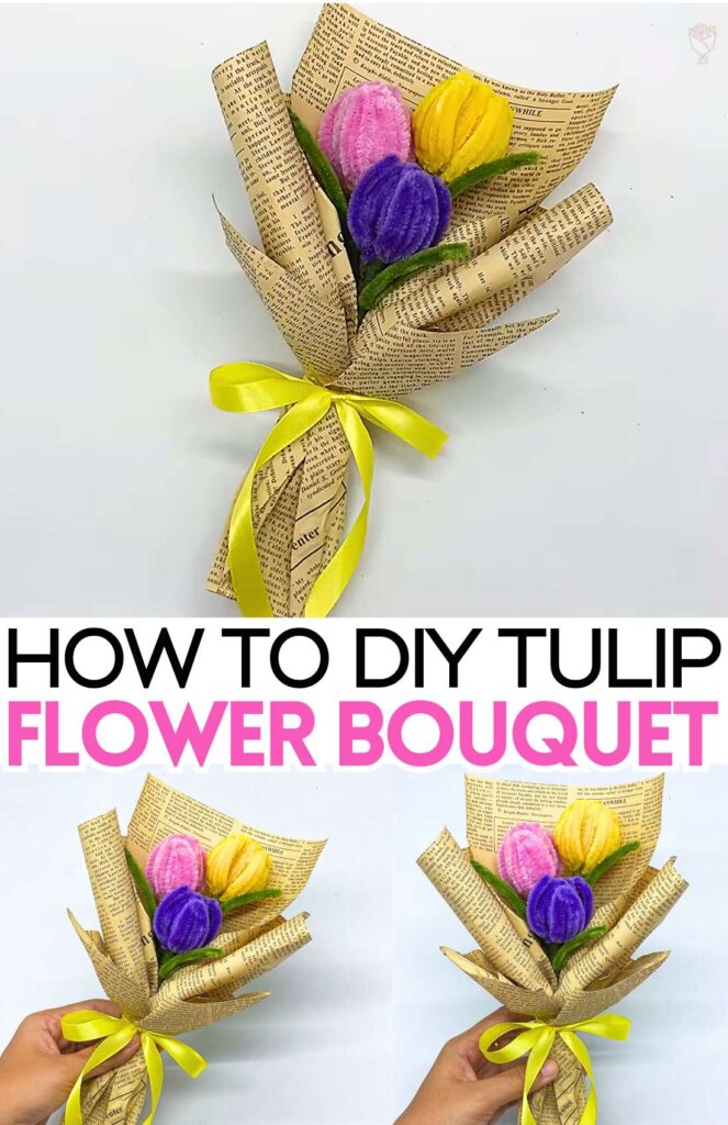 With the newspaper bouquet wrap and three colors of tulip, this chenille stem mini bouquet looks so good.