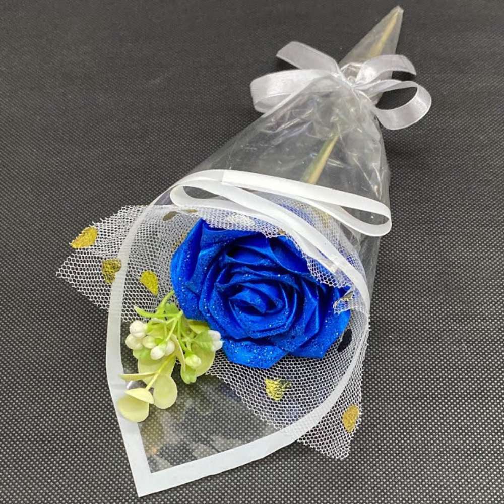 This is a glittery satin ribbon blue rose wrapped in transparent insulation and spider mesh with heart stickers. It is longer and designed as a cone bouquet.