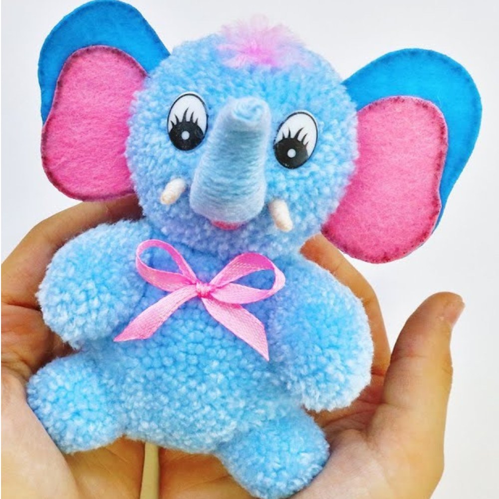 This blue baby elephant measures 11cm and is as simple as the first no-knit animal. The idea is to craft three types of trims in the pom poms for different parts of the elephant. It will make it look shaped perfectly.