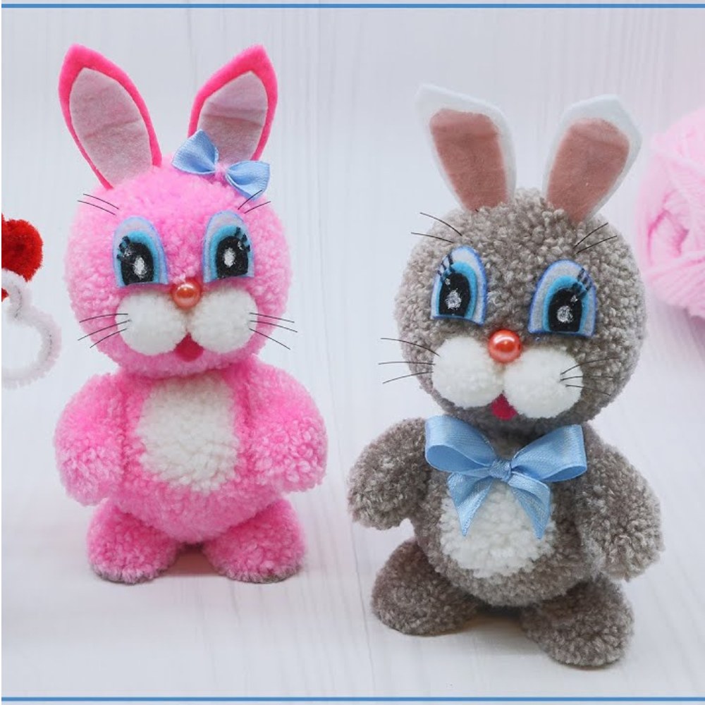 Grab two colors of acrylic yarn and white little pom poms to craft these sitting rabbit plushies. This time, you need a pom pom with white inside the blue head and the belly.